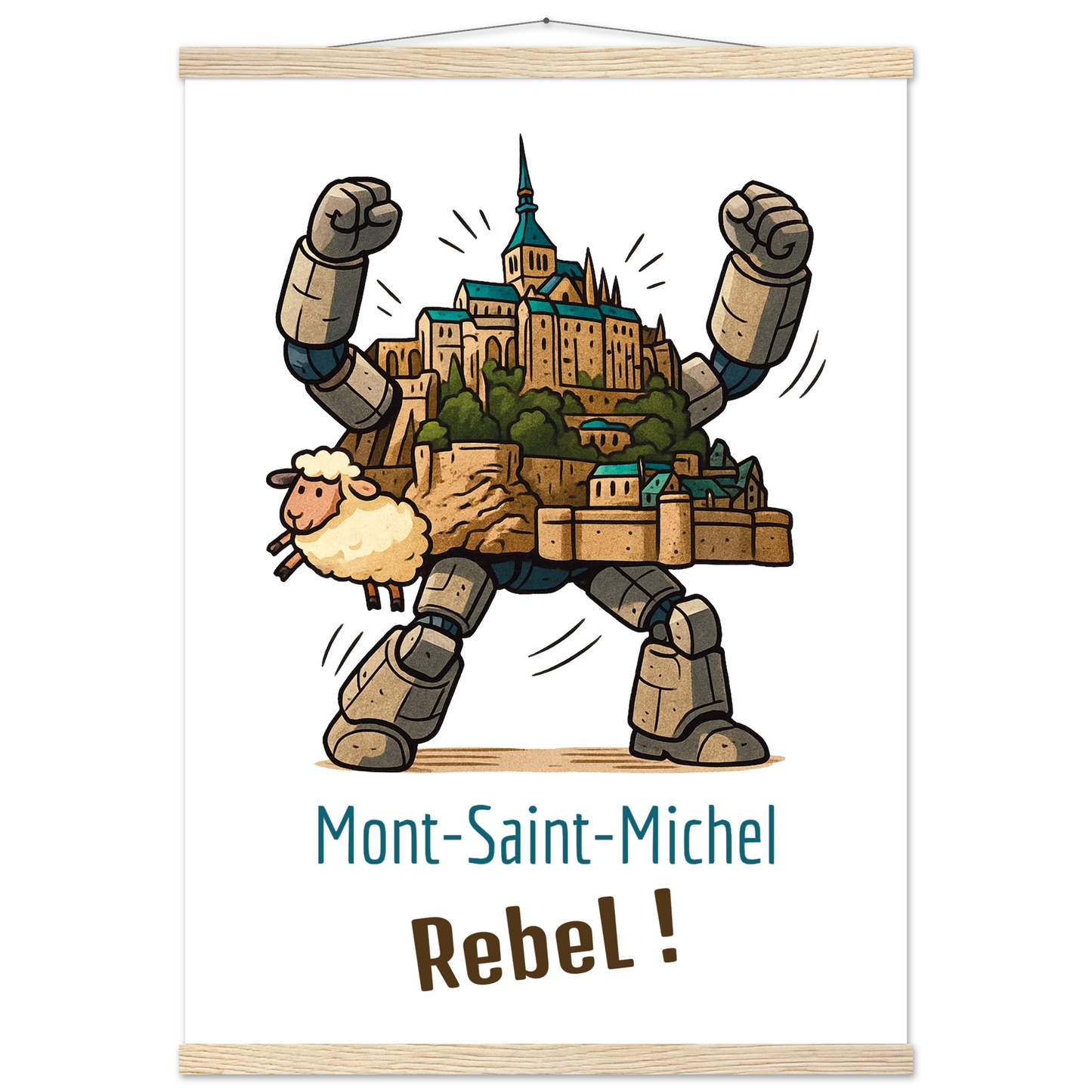 Ce visuel unique transforme le Mont-Saint-Michel en colosse articulé, ancré dans le paysage mais prêt à bouger. Un symbole de résistance tranquille, avec un mouton en mode copilote pour garder les sabots sur terre.