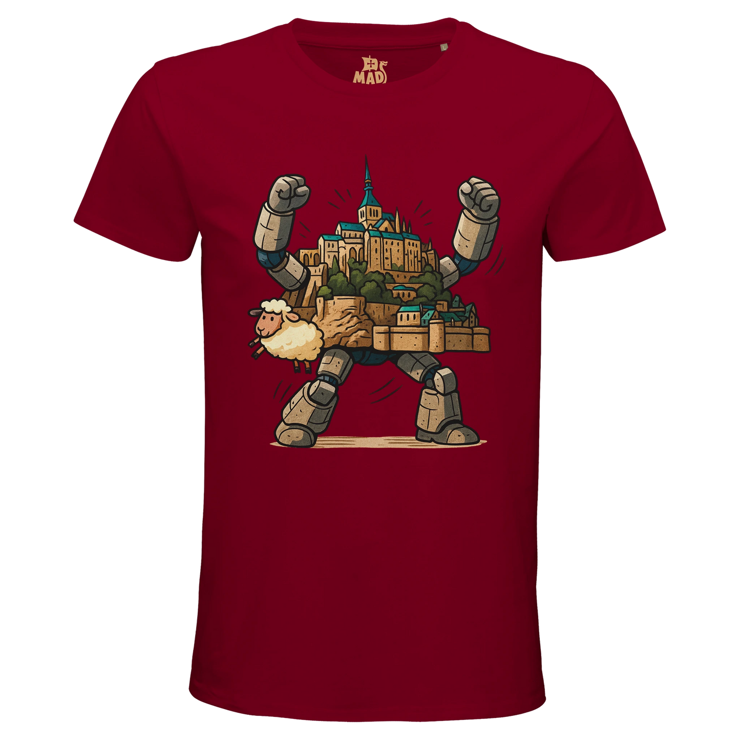 Ce t-shirt en coton bio met à l’honneur un Mont-Saint-Michel réinventé : géant articulé, prêt à marcher droit dans la légende, avec son fidèle mouton en co-pilote.